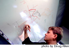Using markers on a dryboard in his office, Gill explains the difference, drawing a large arch on a graph with the word "Liberal" on the left side and "Conservative" on the right.