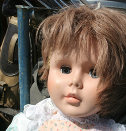 One display, under a blue tarp roof, featured an assortment of dolls