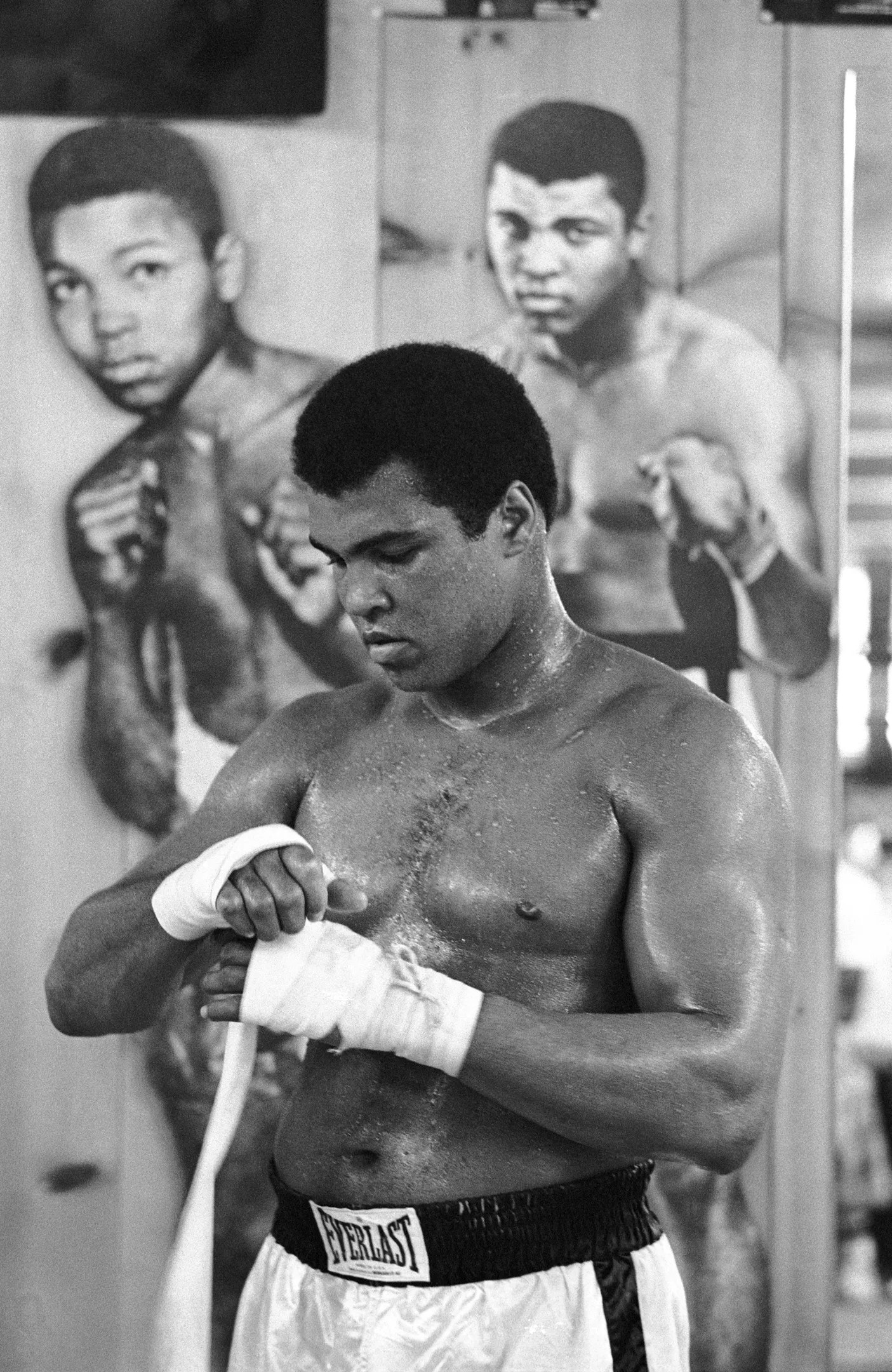 Another assignment, from the German newspaper Stern, required Visalli to photograph Muhammad Ali in his gym as he trained for a fight. Visalli was after action shots for Stern, but something outside of the ring caught his eye: two posters of the fighter in his teens, signed Cassius Clay. The photographer brought Ali out of the ring and asked him to stand in front of the posters. The shot Visalli produced shows the boxer absorbed in the activity of wrapping his hand as images of his former self, bearing another name, seem to peer out at him from the past.