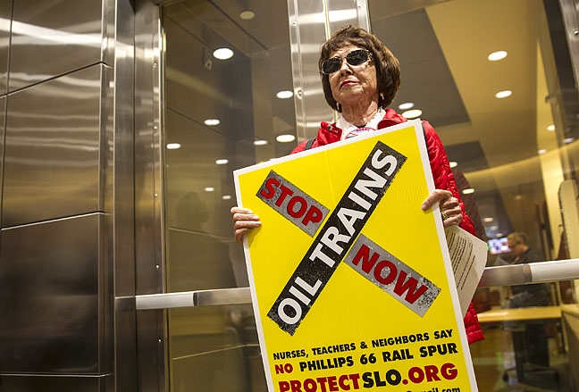 Cheryl Storton from Arroyo Grande expresses her opposition to the Phillips 66 rail spur project at the SLO County Planning Commission meeting on Thursday, Sept 22.